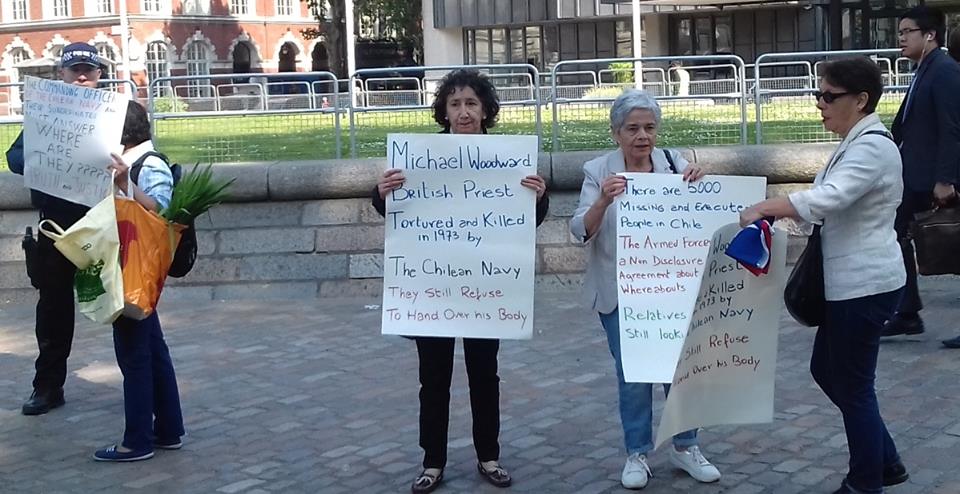ENVÍO ESPECIAL DESDE LONDRES PARA PRIMERA LÍNEA PRENSA. Hoy 21 de mayo a las 9 AM de Londres una delegación de la Armada de Chile acompañada de otros miembros de las FFAA chilenas ridieron un homenaje en la cripta donde se encuentran los restos de Lord Cochrane en la Abadía de Westminster. Sin embargo para su sorpresa un grupo de chilenos protestaron frente a ellos demandando justicia por los detenidos desaparecidos y ejecutados políticos en Chile y relevando la figura del sacerdote y ciudadano británico Michael Woodward, muerto en el buque Esmeralda pocos días después del golpe civil-militar del 73.